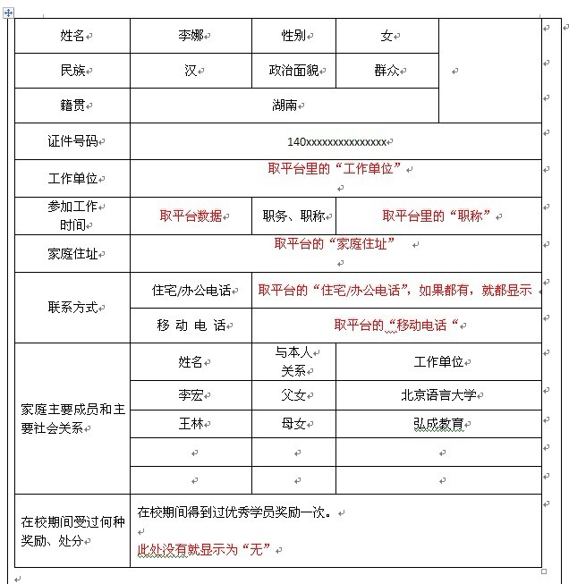 点击【完成】按钮,如果未到300个字,需要提示不能保存,提示学生必须要输入300个字符。如果学生自我鉴定符合要求,保存学生填写的毕业生登记表,页面返回到毕业生登记表的home页。保存过毕业生登记表的学生,【开始填写】按钮改名为【修改毕业生登记表】,旁边显示“预览毕业生登记表”链接,学生可以随时预览毕业生登记表。预览显示要求同模板。预览格式如下